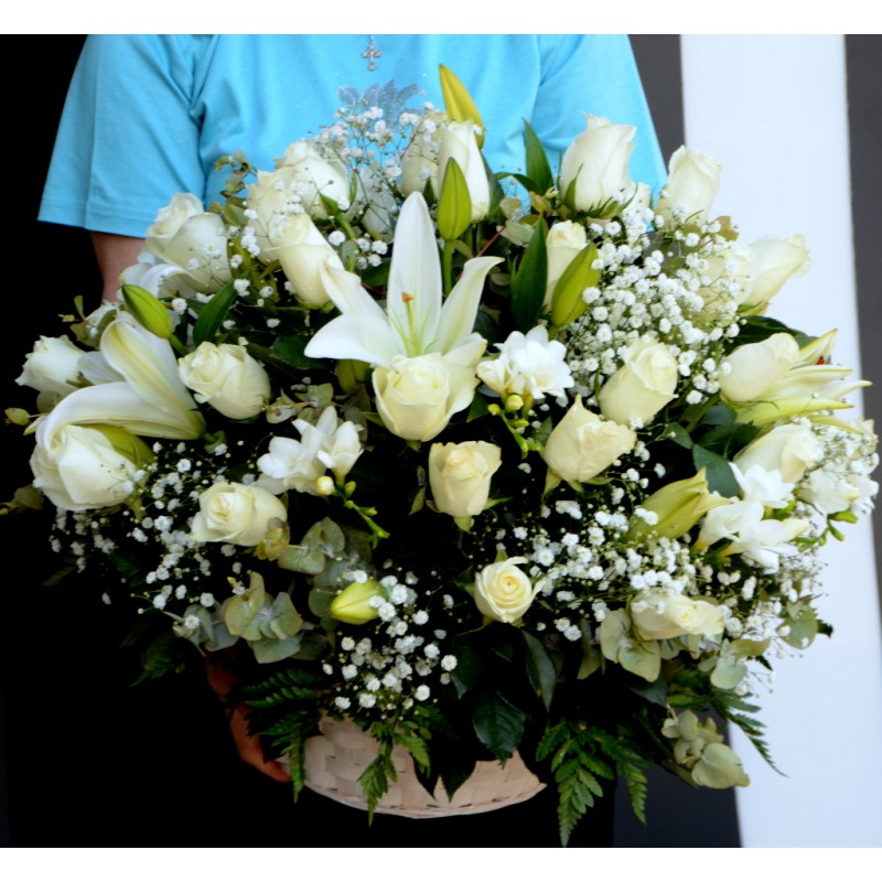 Aranjament in cos nuiele cu 20 trandafiri albi, 4 crini, frezii, gypsophila si verdeata, fixat in burete floral pentru a conferi prospetime florilor cat mai mult timp. Produsul va fi insotit de un mesaj cu textul ales de Dvs. in formularul de comanda.