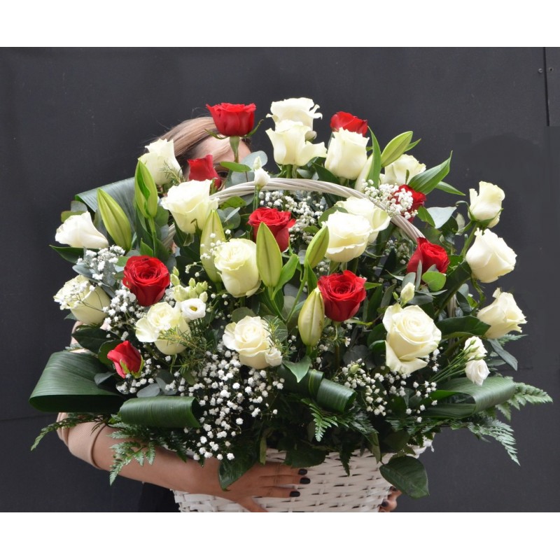 Aranjament in cos nuiele cu 20 de trandafiri albi si rosii, crini, eustoma, gypsophila si verdeata, fixat in burete floral pentru a conferi prospetime florilor cat mai mult timp. Produsul va fi insotit de un mesaj cu textul ales de Dvs. in formularul de comanda.