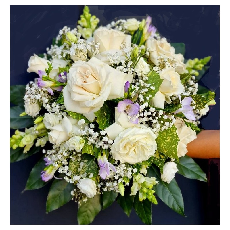 Jerba rotunda cu 6 trandafiri albi, frezii, eustoma, antirrhinum (sau alte flori albe) gypsophila, verdeata si accesorii. Aranjamentul este lucrat in burete umed pentru a mentine florile timp indelungat.