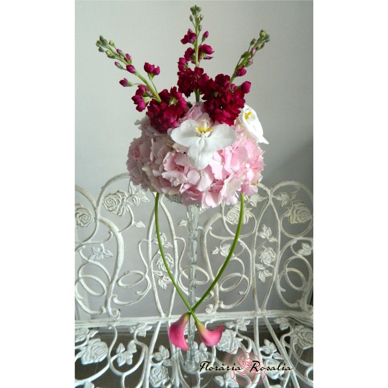Aranjament pe platou H60cm cu hortensii, cale, orhidee phalaenopsis si mathiola.