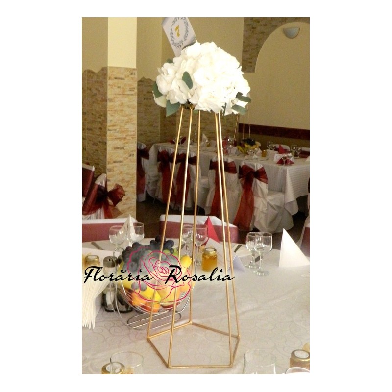 Aranjament pe suport auriu cu hortensii albe si verdeata.. Culorile aranjamentului pot diferi in functie de preferintele Dvs.