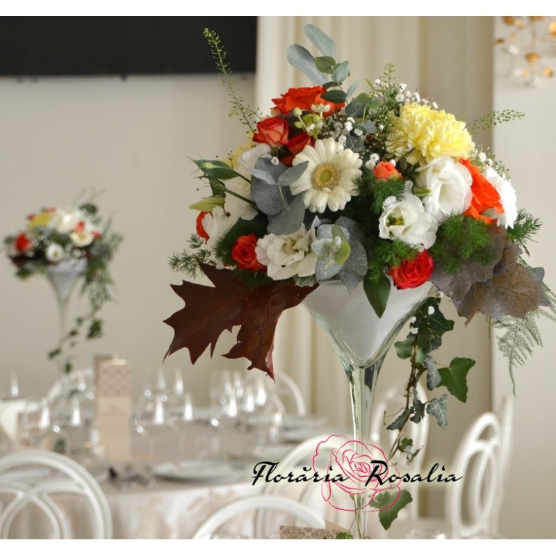 Aranjament cu volum pe cupa Martini cu hortensie, trandafiri, miniroze, eustoma,crizanteme, minigerbera, gypsophila, eucalipt, quercus, accesorii