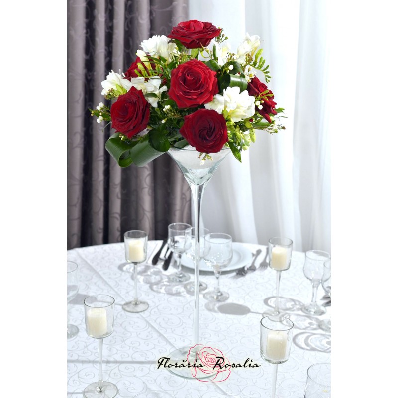 Aranjament pe cupa Martini cu 9 trandafiri , 8 frezii si verdeata.