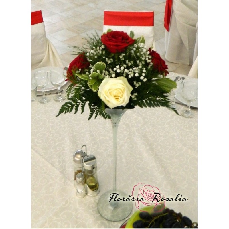Aranjament pe cupa Martini cu 5 trandafiri , gypsophila si verdeata.