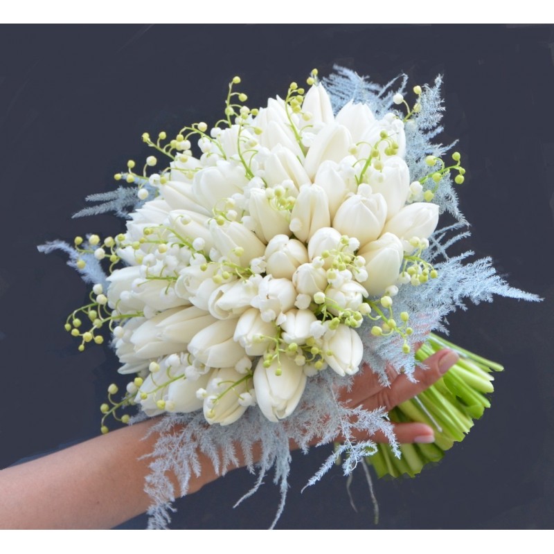 Buchet cu 41-45 lalele albe, lacramioare, accesorii.
