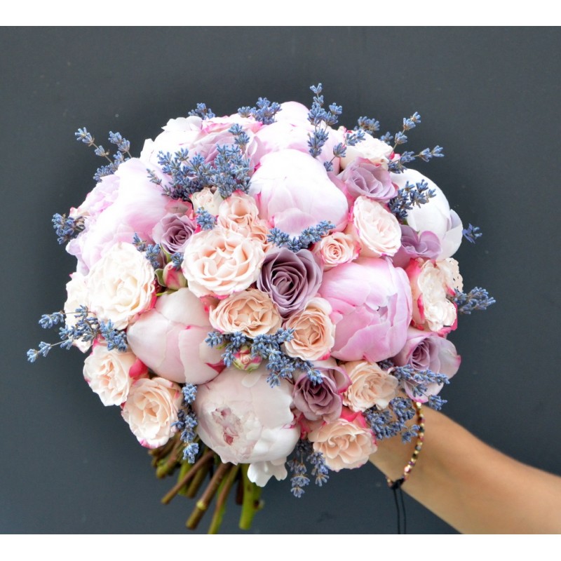Buchet cu 7 bujori roz, 8 trandafiri mov, miniroze, lavanda, accesorii
