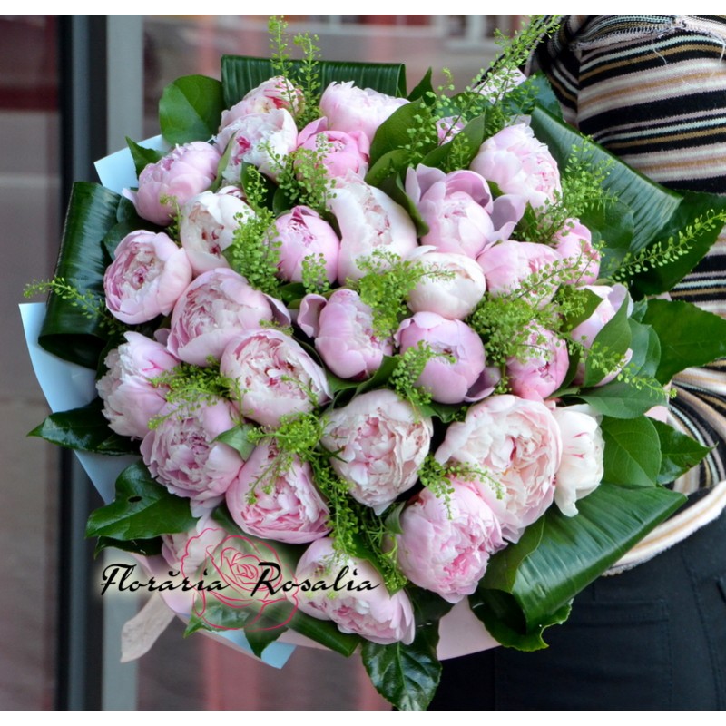Buchet cu 29 bujori,verdeata, accesorii. Produsul va fi insotit de o felicitare personalizata cu textul ales de dumneavoastra in formularul de comanda.