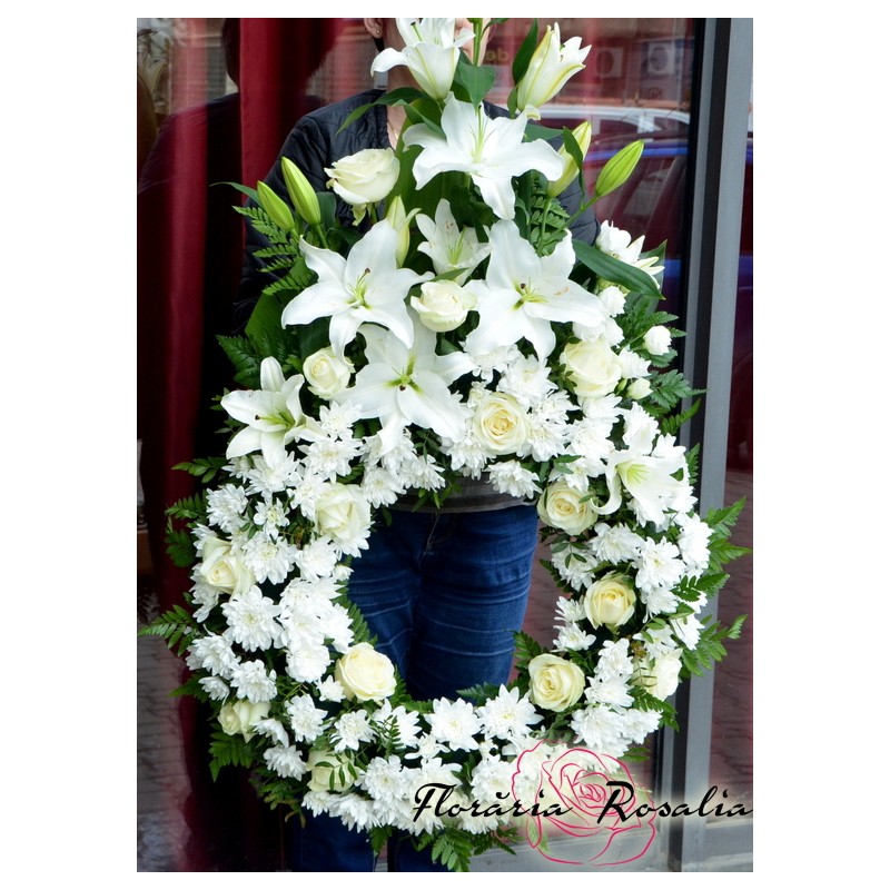 Coroana in forma de lacrima realizata pe suport cu burete, diametru aprox 70 cm, Inaltime cca 100 cm, contine 12 trandafiri, crini, crizanteme sau garoafe. Produsul poate fi realizat si in alte nunte coloristice.
