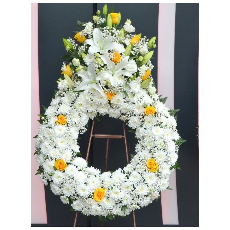 Coroana in forma de lacrima realizata pe suport cu burete, diametru aprox 70 cm, Inaltime cca 100 cm, contine 12 trandafiri, crini, crizanteme sau garoafe. Produsul poate fi realizat si in alte nunte coloristice.
