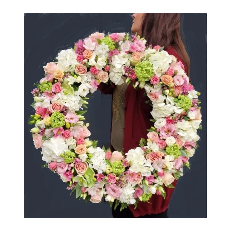 Coroana rotunda realizata pe suport cu burete, diametru aprox 65 cm, contine hortensii, trandafiri eustoma, alstroemeria, miniroze, frezii,viburnum sau alte flori verzi, verdeata. Produsul poate fi realizat si in alte nunte coloristice.