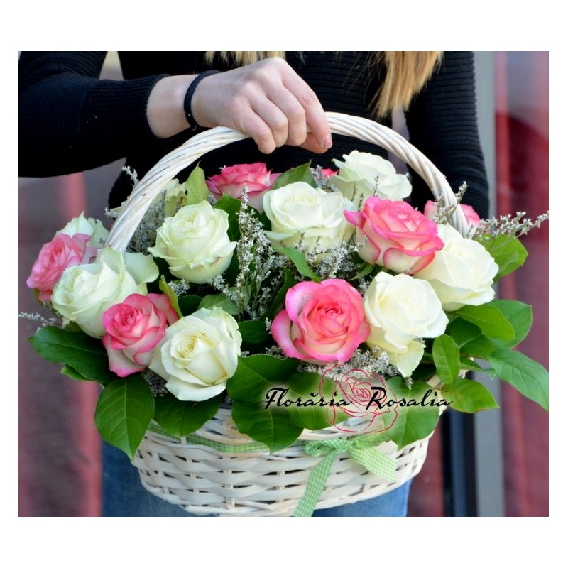 Aranjamentul contine 15 de trandafiri multicolori, cos de nuiele si burete floral, care confera o usurinta mai mare florilor sa se mentina proaspete.