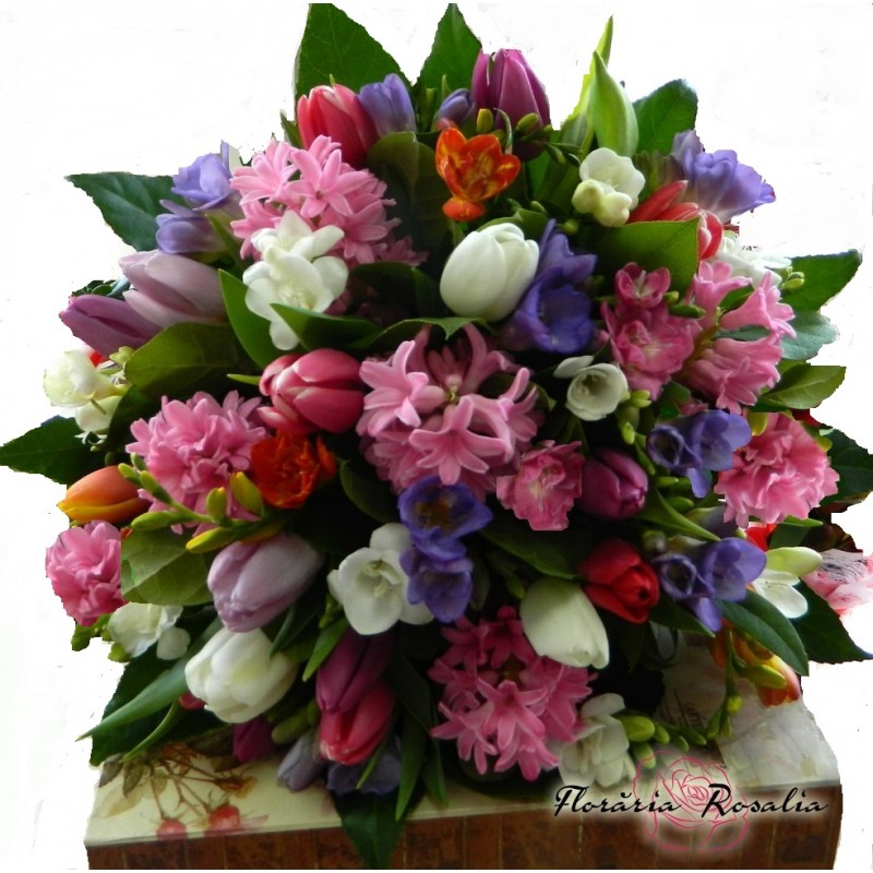 Buchet cu 51 fire de zambile,lalele si frezii, accesorii.. Includem o felicitare pe care o personalizam cu mesajul Dvs.